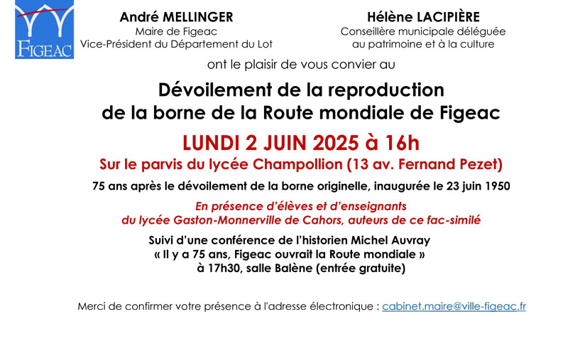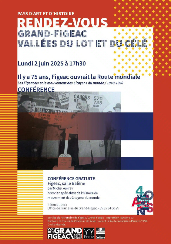 L'inauguration de cette borne a été suivie d'une conférence de Michel Auvray, historien spécialiste de l’histoire du mouvement des Citoyens du monde, sur le thème « Il y a 75 ans, Figeac ouvrait la Route mondiale. Les Figeacois et le mouvement des Citoyens du monde / 1949-1950 ».