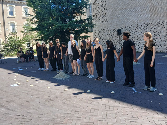 et Alessandro Monsutti, anthropologue, avec le groupe Ashika et un collectif d'adolescents cadurciens.
